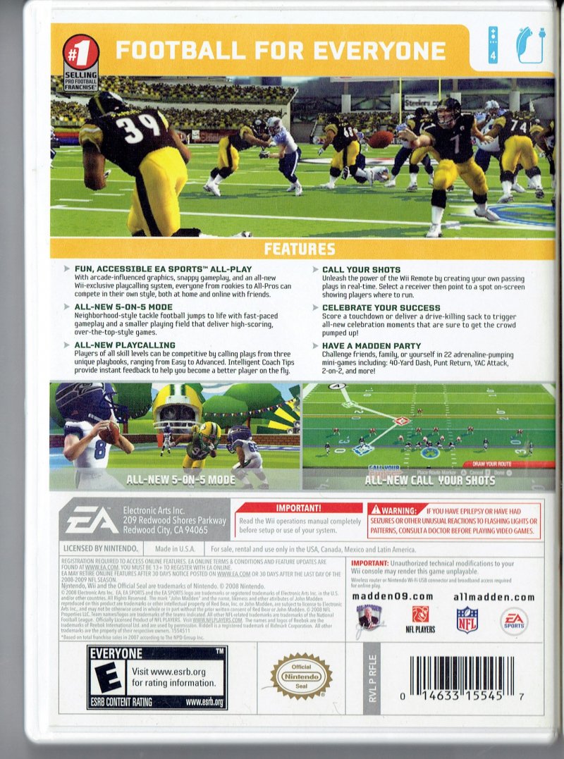 more great Video Games @ www.everything-collectibles.com Nintendo Wii Madden 2009 All-Play video Game Complete (disc Case and Manual). This Video Game is in good used condition as you can see from the picture tested and works. if you have any further questions please don't hesitate to ask! if your order is over $50 Shipping is FREEE within The U.S.!!!