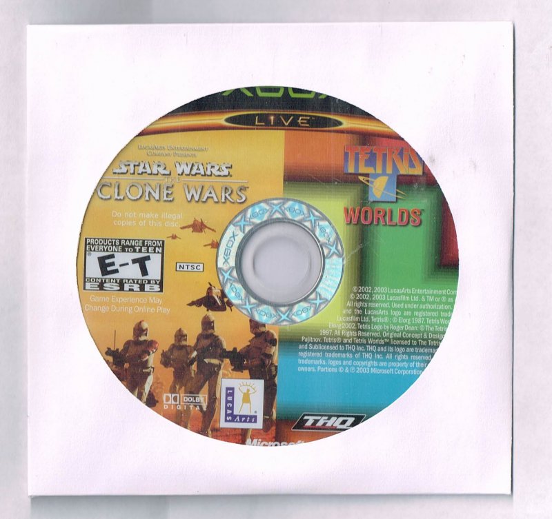 more great Video Games @ www.everything-collectibles.com Clone Wars Tetris Worlds Combo Video Game Microsoft XBOX Disc Only. This Video Game is in good used condition as you can see from the picture tested and works. This is For the Game Only and a generic Sleeve to protect the game in shipment. if you have any further questions please don't hesitate to ask! if your order is over $50 Shipping is FREEE within The U.S.!!!