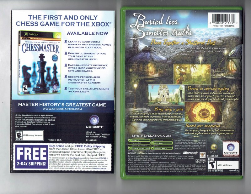 more great Video Games @ www.everything-collectibles.com Myst IV Revelation video Game Microsoft XBOX CIB Rare HTF. This Video Game is in good used condition as you can see from the picture tested and works. Comes with Case, Cover Art, Instruction Booklet and Disc. if you have any further questions please don't hesitate to ask! if your order is over $50 Shipping is FREEE within The U.S.!!!