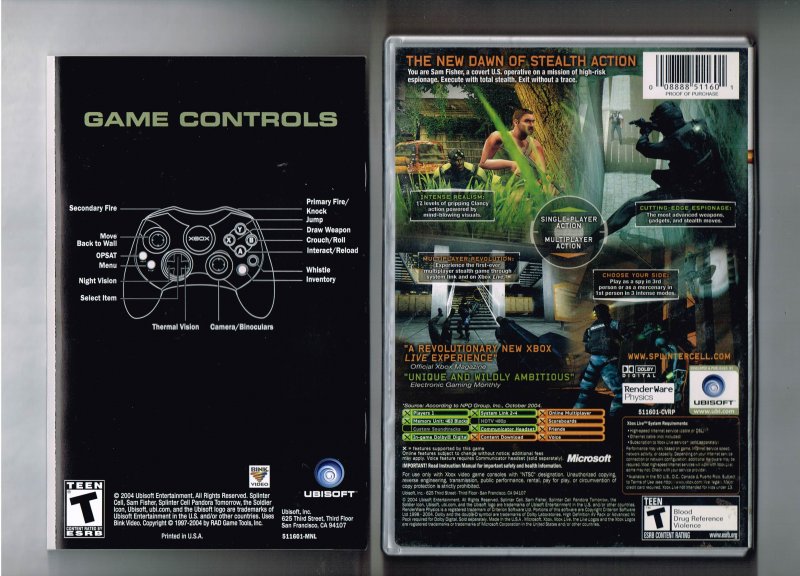 more great Video Games @ www.everything-collectibles.com Splinter Cell Pandora Tomorrow Platinum Hits video Game Microsoft XBOX CIB. This Video Game is in good used condition as you can see from the picture tested and works. Comes with Case, Cover Art, Instruction Booklet and Disc. if you have any further questions please don't hesitate to ask! Flat $5 shipping No Matter if you purchase 1 or 100 shipping is only $5 and if your order is over $50 Shipping is FREEE!!!