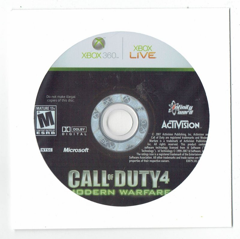 more great Video Games @ www.everything-collectibles.com Call Of Duty 4 Modern Warfare Xbox 360 video Game Disc Only. This Video Game is in good condition as you can see from the picture tested and works. this is for the Disc Only. if you have any further questions please don't hesitate to ask! if your order is over $50 Shipping is FREEE within The U.S.!!!