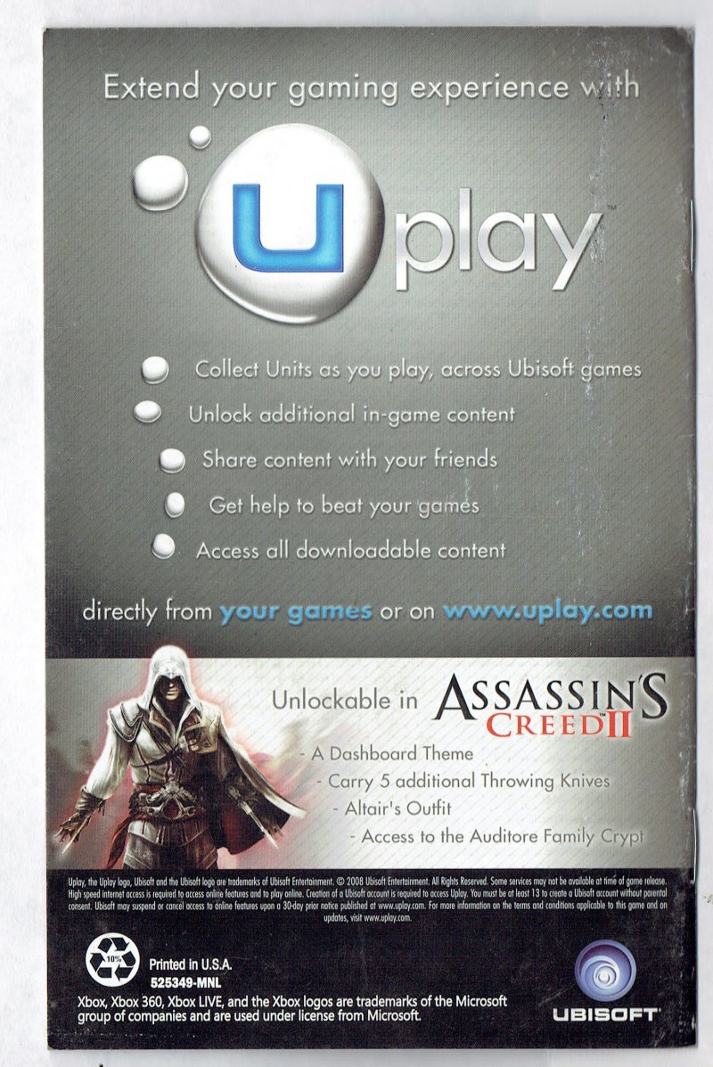 more great Video Games @ www.everything-collectibles.com Assassin's Creed 2 Video Game Microsoft XBOX 360 MANUAL Only. This is for the Manual ONLY. The Manual is in good used condition as you can see from the picture. if you have any further questions please don't hesitate to ask! if your order is over $50 Shipping is FREEE within The U.S.!!!