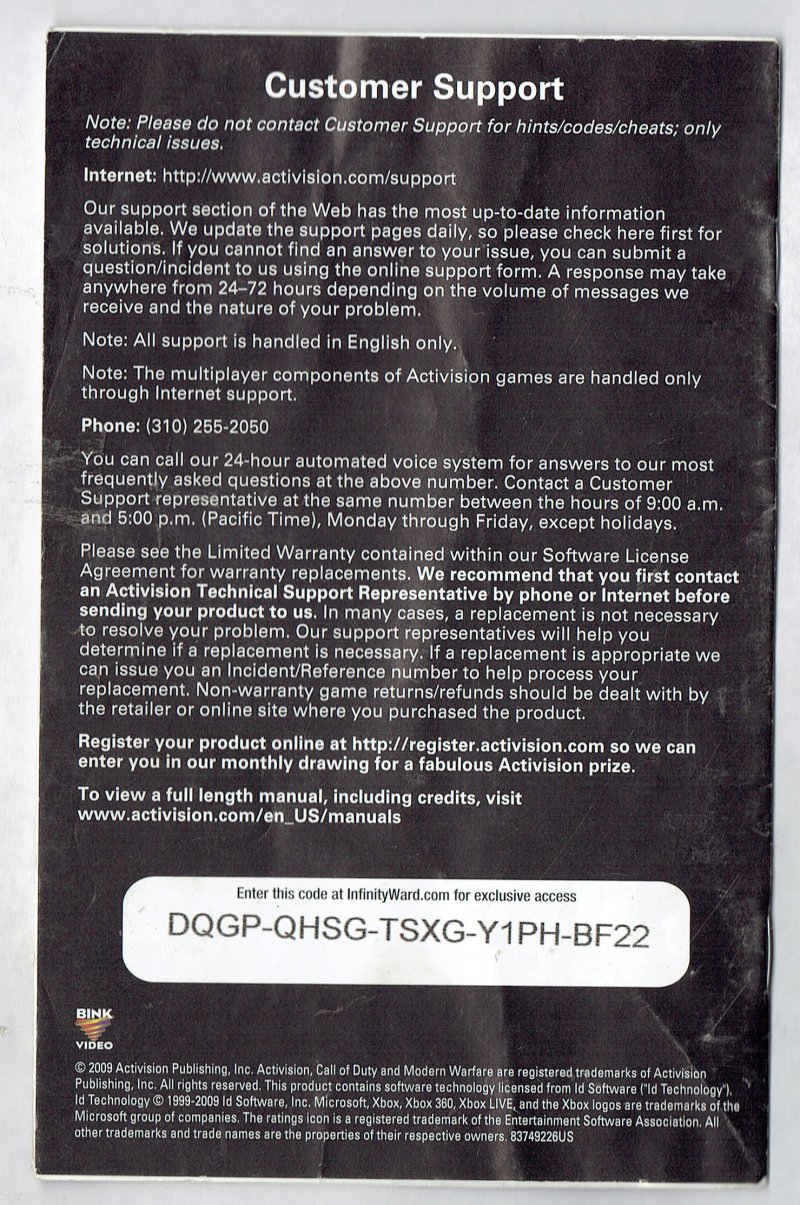 more great Video Games @ www.everything-collectibles.com Call of Duty Modern Warfare 2 Video Game Microsoft XBOX 360 MANUAL Only. This is for the Manual ONLY. The Manual is in good used condition as you can see from the picture. if you have any further questions please don't hesitate to ask! if your order is over $50 Shipping is FREEE within The U.S.!!!