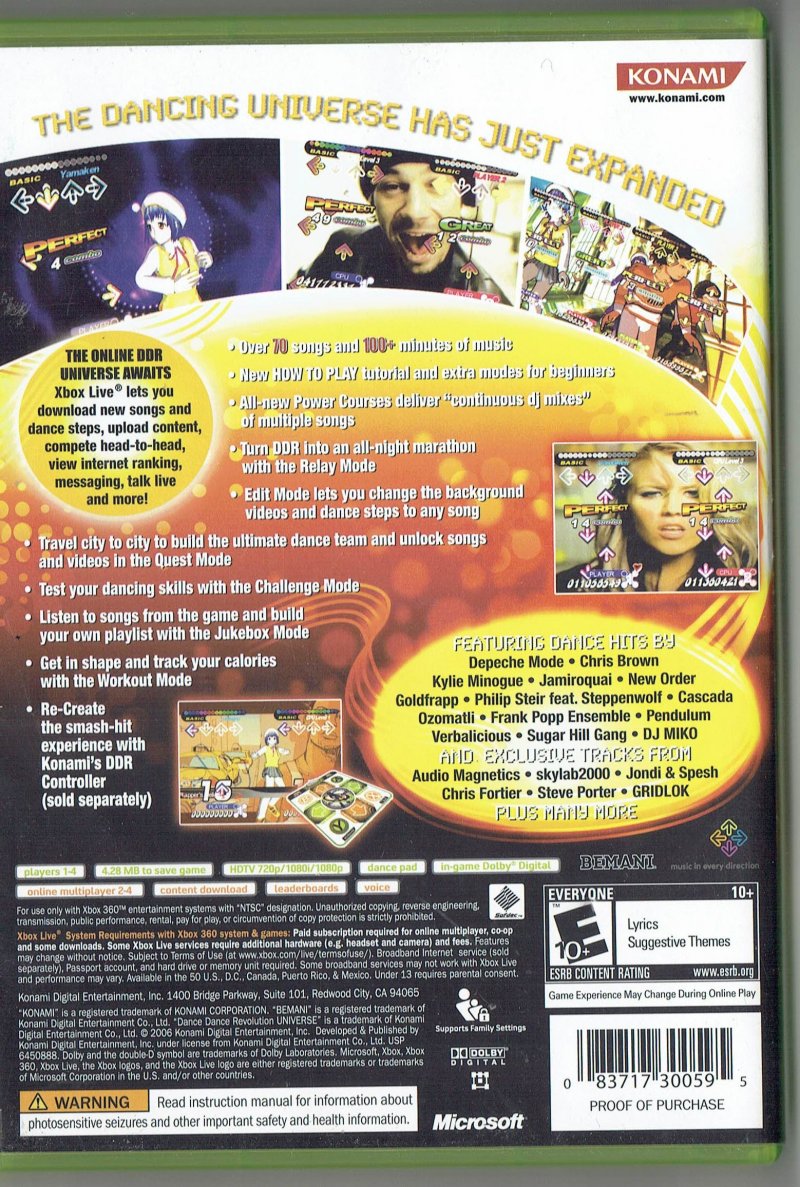 more great Video Games @ www.everything-collectibles.com Dance Dance Revolution Universe Xbox 360 video Game CIB (Case, Manual and Disc). This Video Game is in good used condition as you can see from the picture tested and works. if you have any further questions please don't hesitate to ask! if your order is over $50 Shipping is FREEE within The U.S.!!!