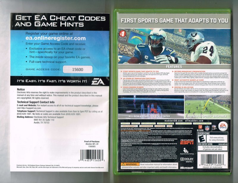 more great Video Games @ www.everything-collectibles.com Madden 2009 Xbox 360 video Game CIB (Case, Manual and Disc). This Video Game is in good used condition as you can see from the picture tested and works. if you have any further questions please don't hesitate to ask! if your order is over $50 Shipping is FREEE within The U.S.!!!