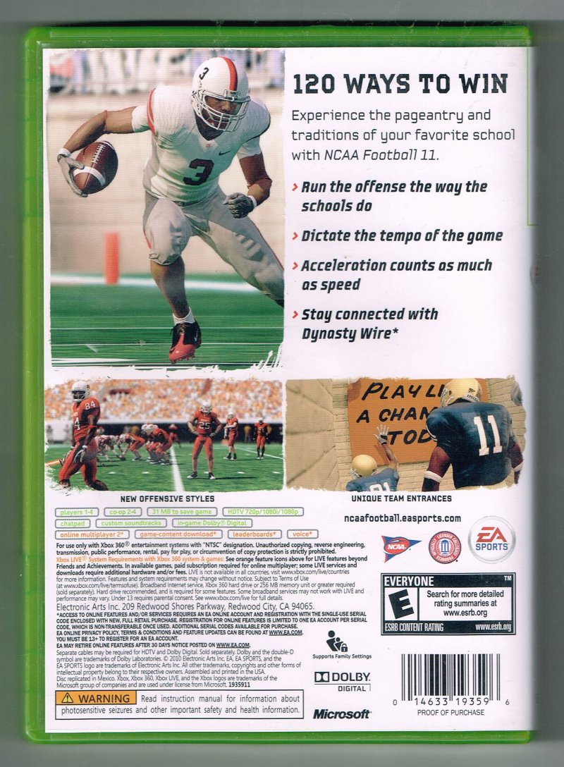 EA Sports NCAA Football 11 Xbox 360 video Game Disc and Case