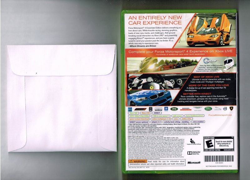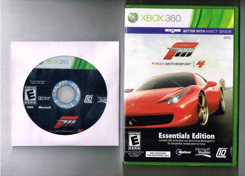 more great Video Games @ www.everything-collectibles.com Forza Motorsport 4 Essentials Edition Xbox 360 video Game Disc and Case. This is for the Disc and Case Only NO Manual. This Video Game is in good used condition as you can see from the picture tested and works. if you have any further questions please don't hesitate to ask! if your order is over $50 Shipping is FREEE within The U.S.!!!