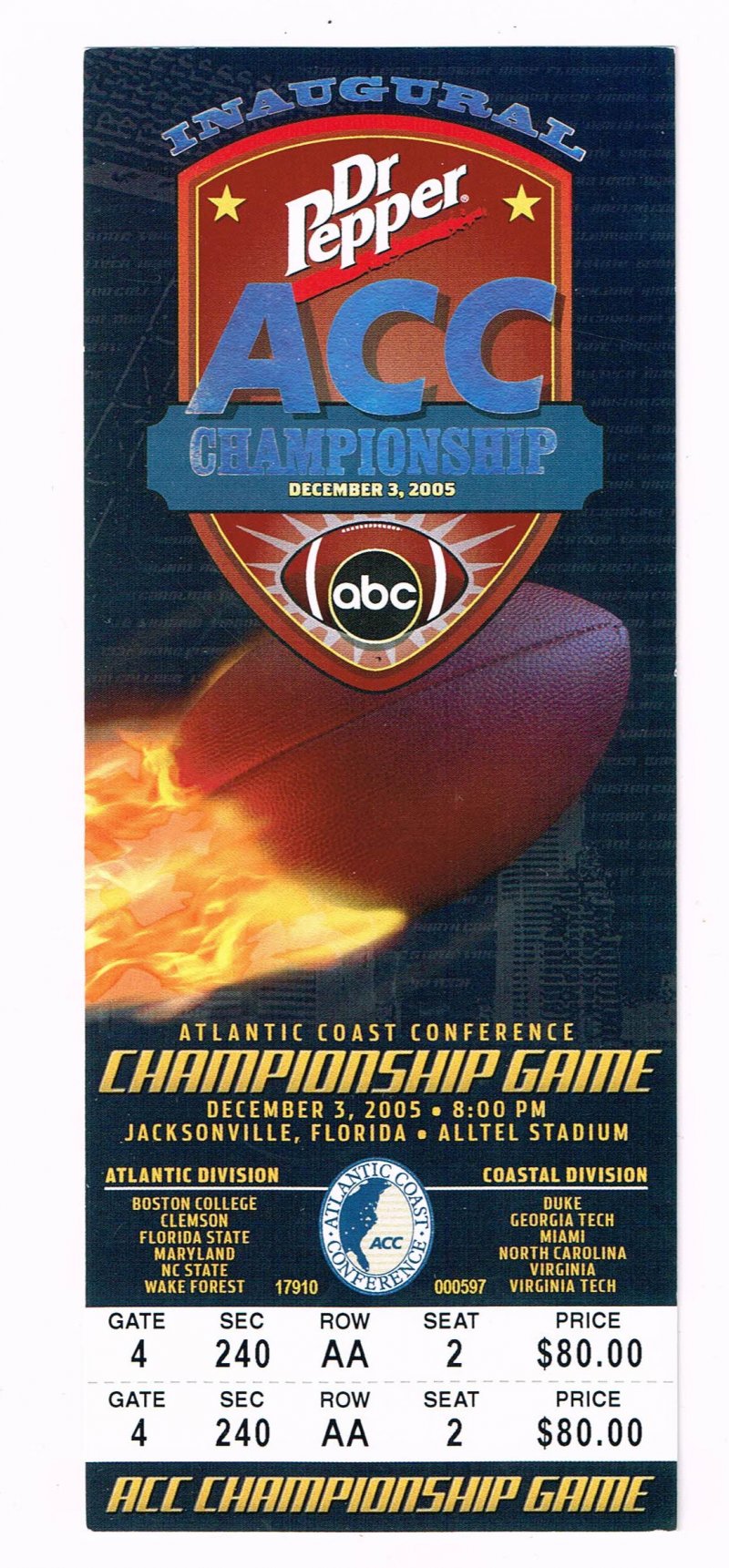 2005 Inaugural ACC Championship Game Full Ticket Virginia Tech Boston College. This Ticket is in very good condition no rips tears writing or creasing just some minor handling wear as seen in the picture does not distract from its rarity still a rare vintage hard to find College Football Championship Ticket!