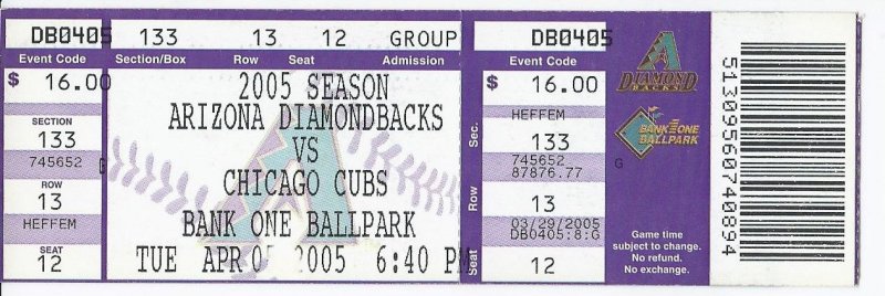 2005 Chicago Cubs @ Arizona Diamondbacks Full Unused ticket April 5th