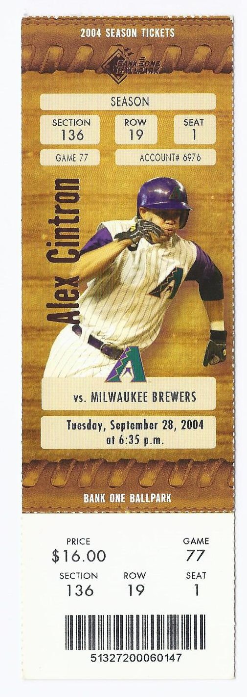 2004 Milwaukee brewers @ Arizona Diamondbacks Full Unused ticket September 28th