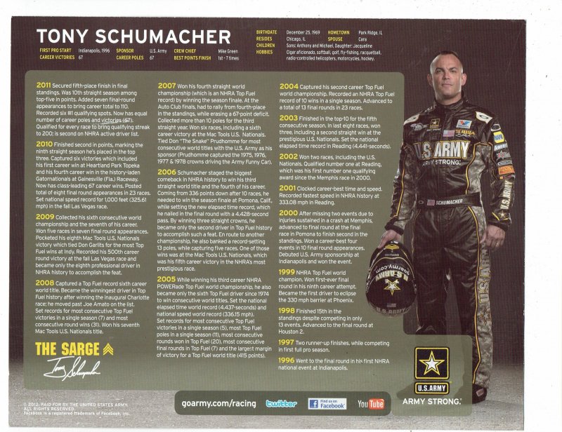 more autographs at www.everythingcollectibles.biz. For sale an Authentic Tony Schumacher Signed Autographed Racing Photo Promotional Advertising Card 8 time NHRA Champion in person. what you see is what you will receive. please look at the photos provided for more details. if you have any questions please don't hesitate to ask. Comes with a COA from Everything Collectibles