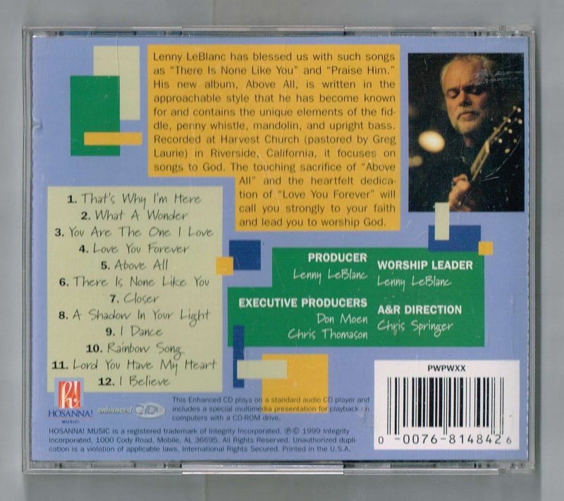More Great CD's @ www.everything-collectibles.com For Sale is an above all with lenny leblanc Hosannai Music CD. in good used condition. adult owned from private collection. please see photo for more details. what you see is what you will receive. please don't hesitate to ask. Free shipping within the US. Please note all CD's Ship via Media Mail.