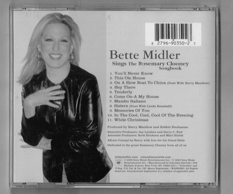More Great CD's @ www.everything-collectibles.com For Sale is an Bette Midler Sings the Rosemary Clooney Songbook Music CD. in good used condition. adult owned from private collection. please see photo for more details. what you see is what you will receive. please don't hesitate to ask. Free shipping within the US. Please note all CD's Ship via Media Mail.