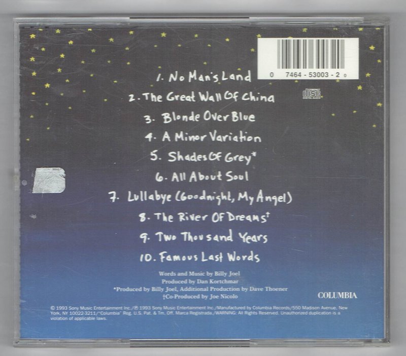 track list No Man's Land The Great Wall Of China Blonde Over Blue A Minor Variation Shades Of Grey All About Soul Lullabye (Goodnight, My Angel) The River Of Dreams Two Thousand Years Famous Last Words