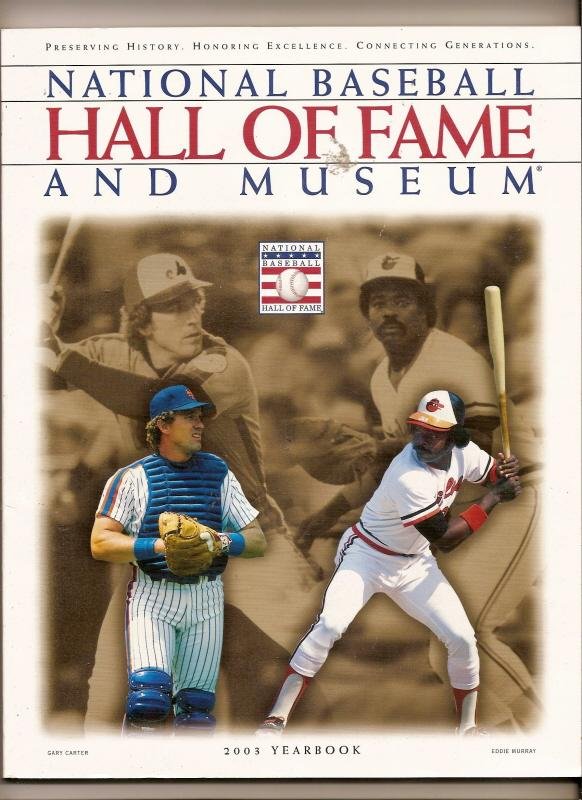 more great collectibles @ www.everythingcollectibles.biz for sale is a rare 2003 Baseball Hall Of Fame Yearbook. its in very good condition no ripped tears or mising pages no writng in or on the program. just some minor handling wear as shown in the photo provided. if you would like any additional photos or a more detailed description please dont hesitate to ask.
