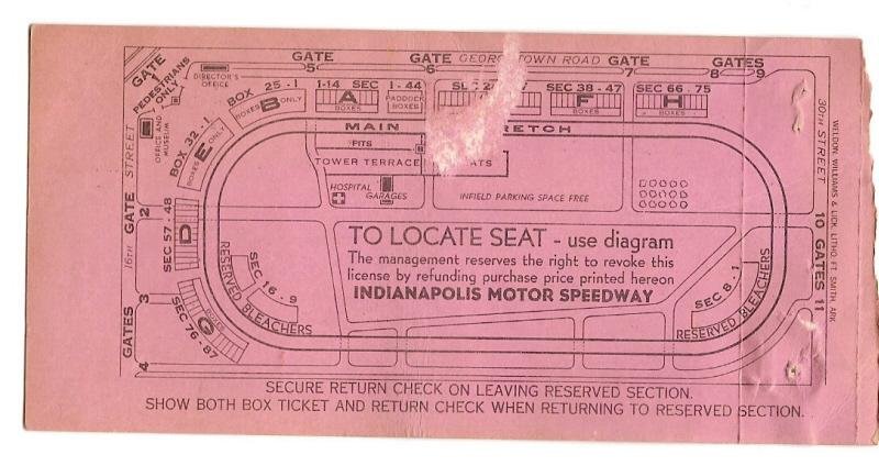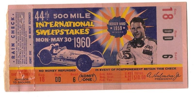 1960 Indianapolis 500 Mile Race Ticket Stub Jim Rathmann winner