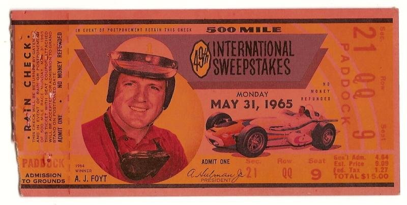1965 Indianapolis 500 Mile Race Ticket Stub Jim Clark winner