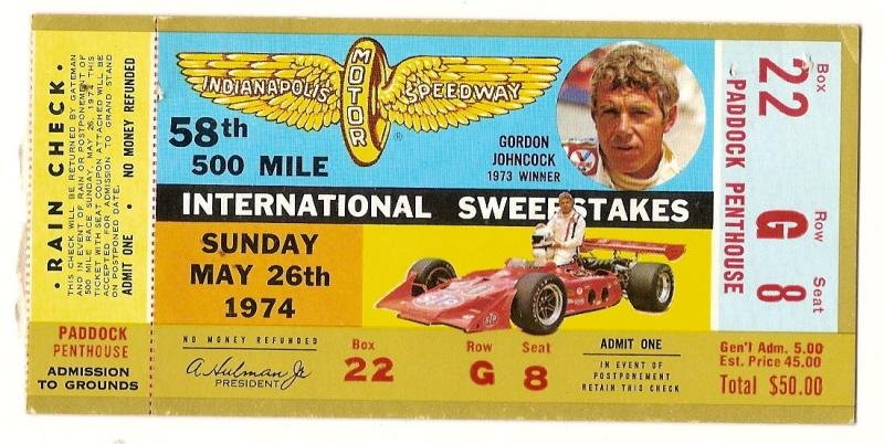 1974 Indianapolis 500 Mile Race Ticket Stub Johnny Rutherford winner