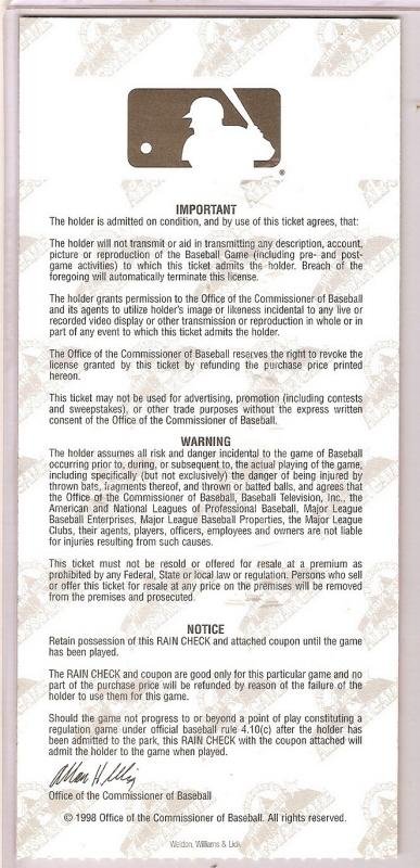 1998 MLB Baseball All Star Game Ticket STub Colorado Rockies! Its in very good Condition no tears rips or writing on the ticket just has some handling wear as you can see from the pictures provided what you see is what you will recieve. a nice RARE piece of Baseball history!