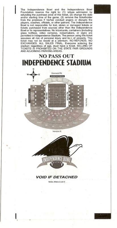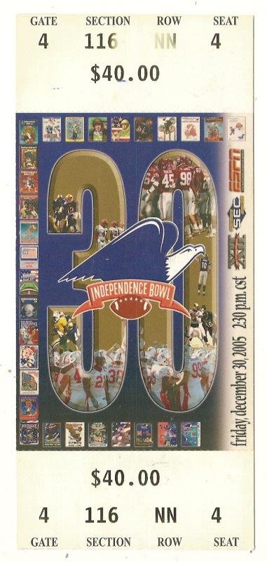2005 Independence Bowl Full Game Ticket Missouri SC. This Ticket is in Very Good Condition no rips tears writing but does have a handling wear as seen in the pictures provided nice RARE piece of College football History if you have any further q