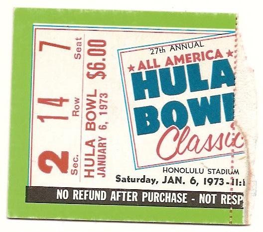 1973 Hula Bowl Game Ticket Stub. This Ticket is in very good condition no rips tears or writing and would look great framed with a program or picture a RARE piece of College Bowl History. if you have any questions please don't hesitate to ask. Fast same or next day shipping with delivery confirmation within the U.S. This Item Ships Free within the United States.