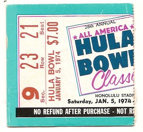 1974 Hula Bowl game Ticket stub. This Ticket is in very good condition no rips tears or writing and would look great framed with a program or picture a RARE piece of College Bowl History. if you have any questions please don't hesitate to ask. Fast same or next day shipping with delivery confirmation within the U.S. This Item Ships Free within the United States.