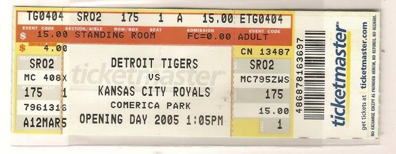 2005 Tigers Opening Day Full Ticket Tigers Royals. it is in very good condition no writing or tears on the ticket just some minor handling wear still a nice RARE piece of Baseball History. if you have any further questio