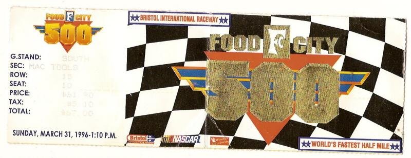 more great collectibles @ www.everythingcollectibles.biz for sale is a rare 1996 Nascar Food City 500 Ticket Stub BMS. ticket is in very good condition no rips tears or writing just some minor handling wear. what you see si what you will recieve.