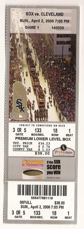 2006 white Sox Cleveland Opening day Full ticket. it is in very good condition no writing or tears on the ticket just some minor handling wear still a nice RARE piece of Baseball History. if you have any further questio