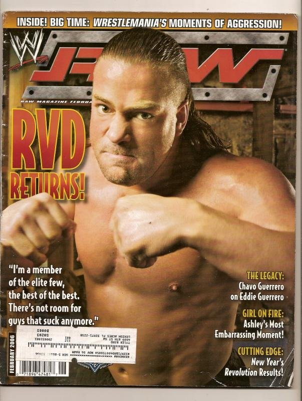 more great Magazines @ www.everythingcollectibles.biz wwe Magazine February 2006 RVD. This Magazine is in very good condition no ripped torn or missing pages no writing in or on the program if you have any further questions please dont