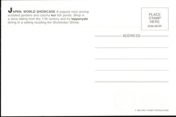 WALT DISNEY WORLD Japan World SHowcase 4x6 Postcard Vintage EPCOT Unused And In VG condition as you can see from the picture (only with in the United states,International Buyers Please contact me for shipping rates)
