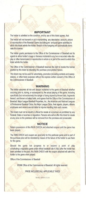 1996 Baseball All Star Game Full Ticket Philadelphia! Its in very good Condition no creasing or writing on the ticket weak as you can see from the picture a nice RARE piece of Baseball History. if you have any further questions please dont hesitate to ask
