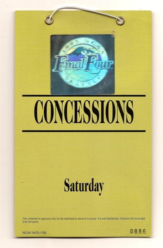 1995 Ncaa Final Four Concessions Pass Ticket. the ticket is in very good condition no creasing rips tears or writing on the ticket as seen in the picture nice RARE piece of FINAL FOUR history if you have any further questions please dont hesitate to askkk!