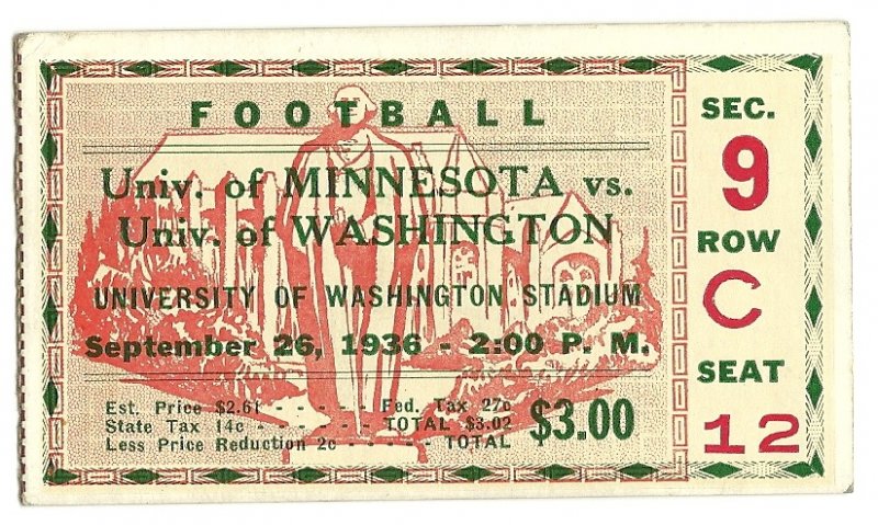 1936 College Football ticket stub Minnesota Washington. This Ticket Stub is in very good condition would look great framed with a program or picture a RARE piece of College Football History. if you have any questions please don't hesitate to ask. Fast same or next day shipping with delivery confirmation within the U.S. This Item Ships Free within the United States.