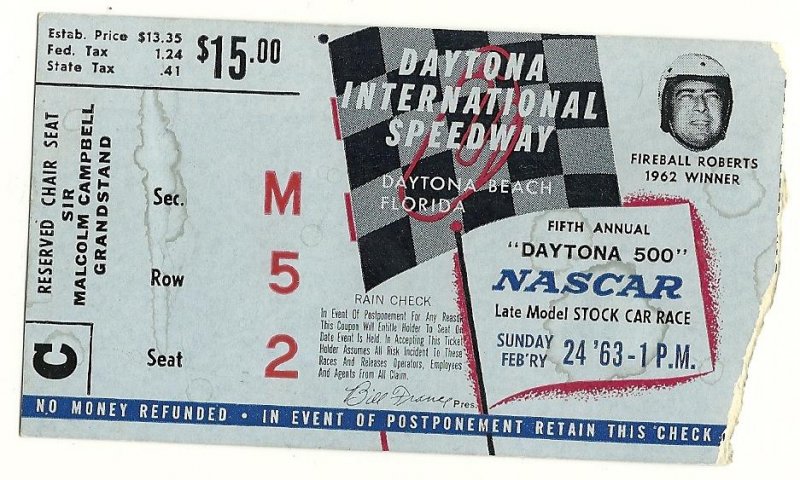1963 Daytona 500 Ticket Stub nascar race. This is a stub it is in very good condition writing or tears on the ticket. just some minor handling wear as seen in the pictures provided. nice RARE piece of Nascar racing History. if you have any questions please don't hesitate to ask. Fast same or next day shipping with delivery confirmation within the U.S. This Item Ships Free within the United States.