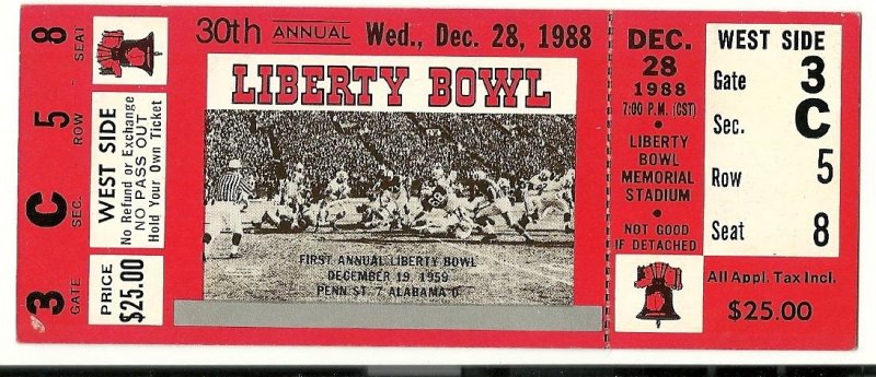 1988 Liberty Bowl Full ticket Indiana South Carolina. This full unused Ticket is in very good condition no rips tears or writing anywhere on the ticket just some minor handling wear as shown in the photos provided. what you see is what you will recieve. would l