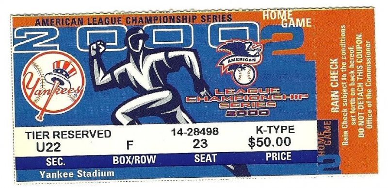2000 ALCS Ticket Stub Yankees Mariners game 2