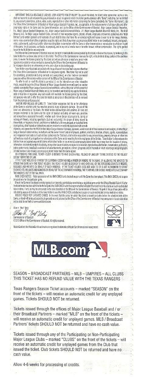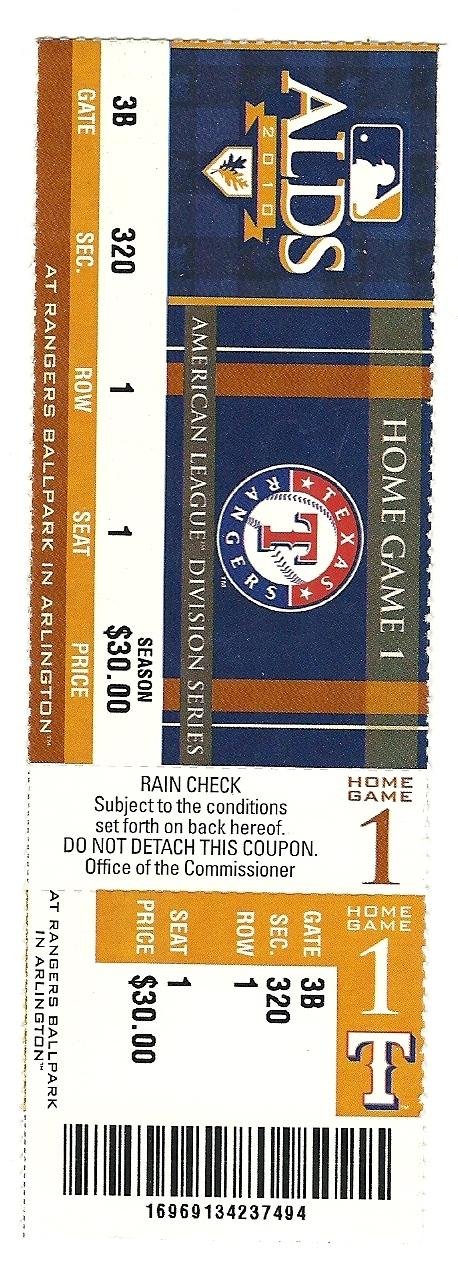 2010 ALDS Full Season Ticket Rays Rangers Game 3. This ticket is in very good condition no rips tears or writing on the ticket. just some minor handling wear. nice RARE piece of Baseball History