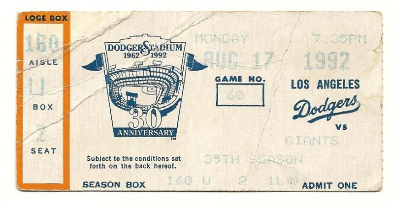 Kevin Gross No Hitter ticket Stub 8/17/92 Dodgers Giants Rare