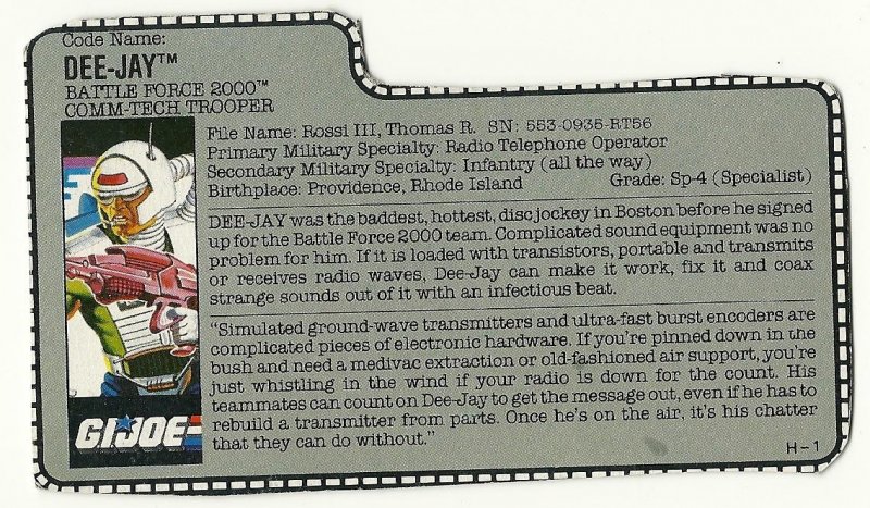 more great GI joe Items @ www.everythingcollectibles.biz 1989 GI Joe Dee Jay Battle Force 2000 Comm Tech Tropper File Card. rare and hard to find. what you see is what you will recieve. fast same or next day shipping with delivery confirmation.