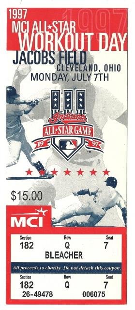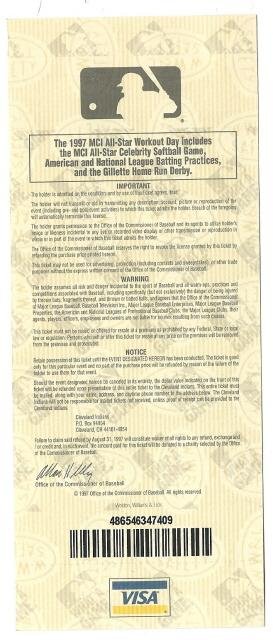 1997 ALL STAR GAME Workout Day Home Run Derby Full TICKET Cleveland. it is in very good condition no writing or tears on the ticket a nice RARE piece of Baseball History. if you have any further questio