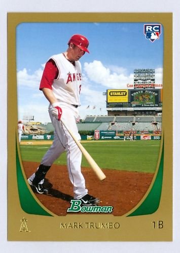 more Great cards @ www.everythingcollectibles.biz For Sale is a 2011 Bowman Gold #193 Mark Trumbo RC Angels in NrMt Condition. all single cards are shipped in Penny Sleeves and top loaders. all orders ship with delivery confirmation as well. we usually ship within 2 days of receiving an order. Shipping is a Flat $2 no matter how many cards you buy 1 or 1000 its still $2.