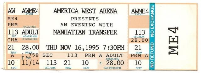 MANHATTAN TRANSFER November 16th 1995 Full Unused Ticket