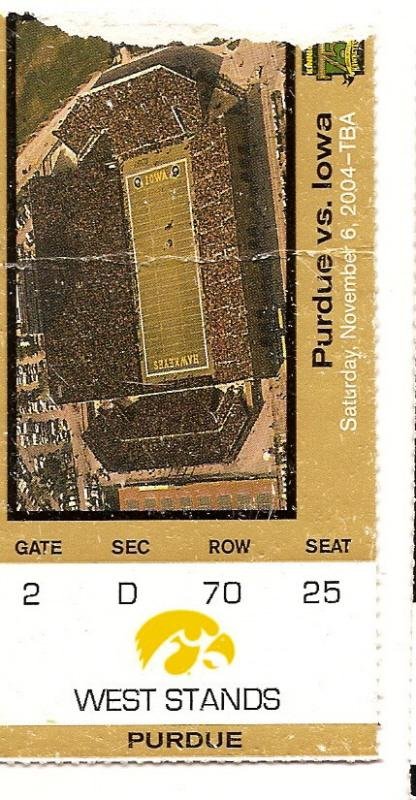more great college football ticket stubs @ everythingcollectibles.biz. for sale is a 2004 Nov 6th Ticket Stub iowa vs Purdue. Its in very good condition just has some minor handling wear as pictured. fast same or next day shipping with delivery confirmation within the U.S.