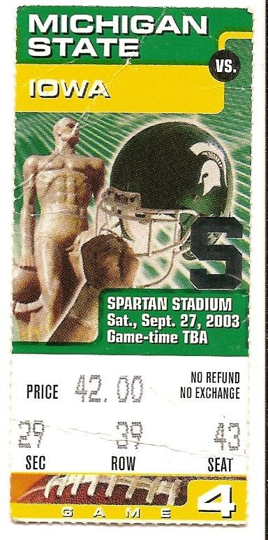 more great college football ticket stubs @ everythingcollectibles.biz. for sale is a 2003 Sept 27th Ticket Stub Michigan State vs Iowa. Its in very good condition just has some minor handling wear as pictured. fast same or next day shipping with delivery confirmation within the U.S.