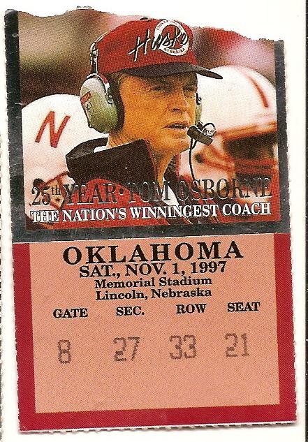 more great college football ticket stubs @ everythingcollectibles.biz. for sale is a 1997 Nov 1st Ticket Stub Nebraska vs Oklahoma. Its in very good condition just has some minor handling wear as pictured. fast same or next day shipping with delivery confirmation within the U.S.