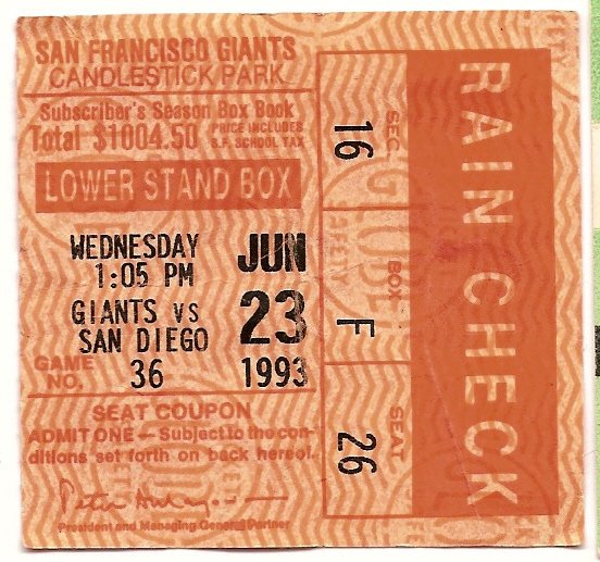 1993 San Diego Padres @ San Francisco Giants ticket stub June 23rd Bud Black 8 k