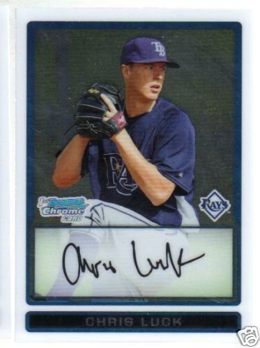 more Great cards @ www.everythingcollectibles.biz For Sale is a 2009 Bowman Chrome Prospect #162 Chris Luck BCP in NrMt Condition. all single cards are shipped in Penny Sleeves and top loaders. all orders ship with delivery confirmation as well. we usually ship within 2 days of receiving an order. Shipping is a Flat $2 no matter how many cards you buy 1 or 1000 its still $2.