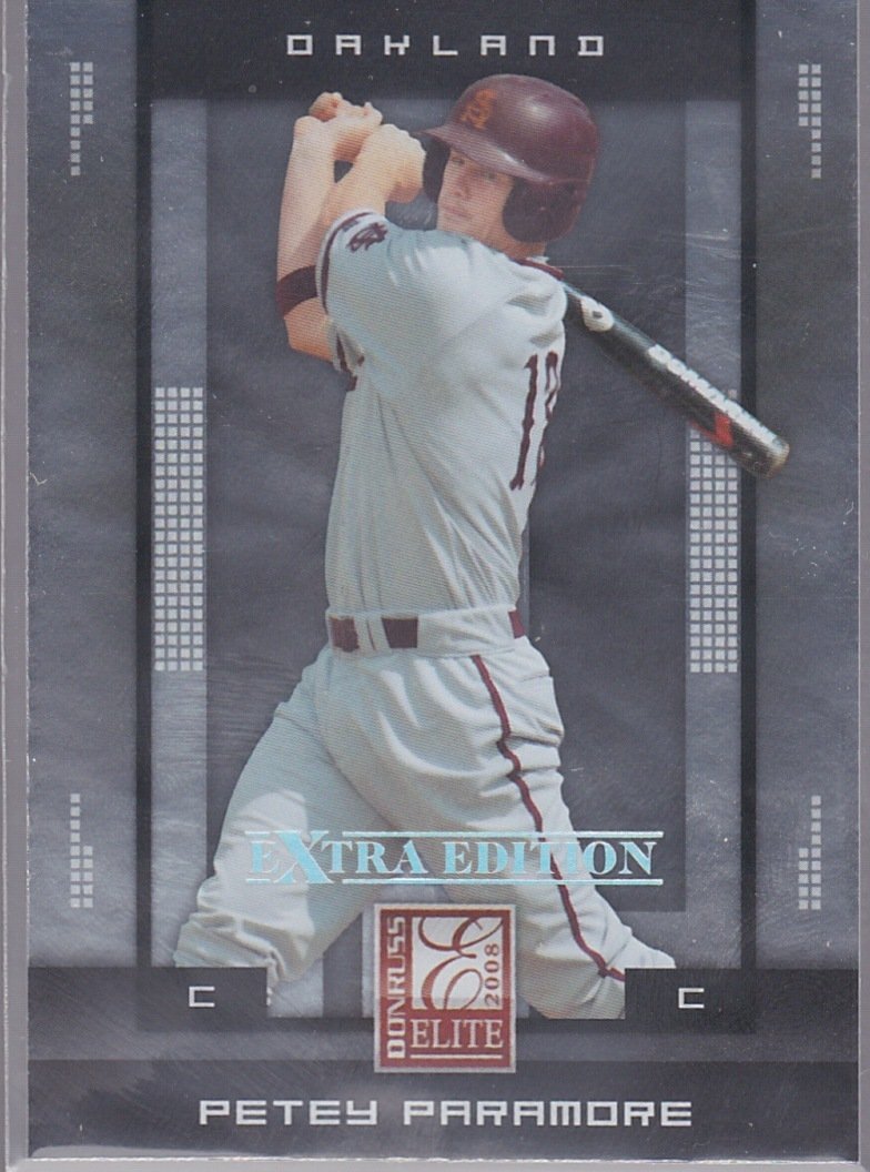 more Great cards @ www.everythingcollectibles.biz For Sale is a 2008 Donruss Elite Extra Edition #80 Petey Paramore in NrMt Condition. all single cards are shipped in Penny Sleeves and top loaders. all orders ship with delivery confirmation as well. we usually ship within 2 days of receiving an order. Shipping is a Flat $2 no matter how many cards you buy 1 or 1000 its still $2.