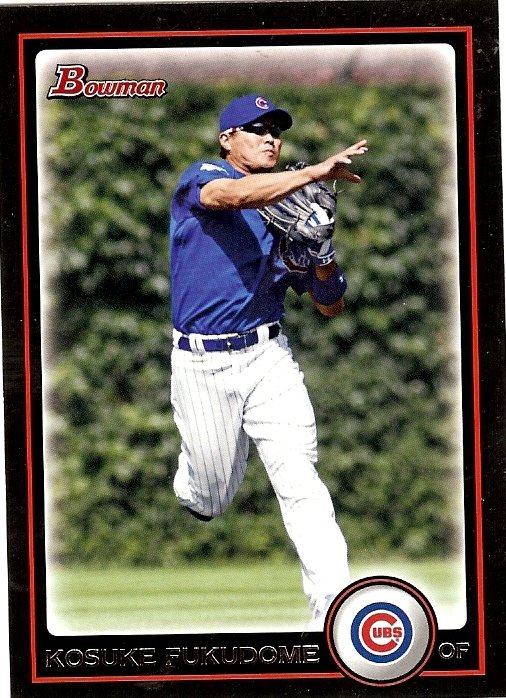 more Great cards @ www.everythingcollectibles.biz For Sale is a 2010 Bowman #74 Kosuke Fukudome Cubs in NrMt Condition. all single cards are shipped in Penny Sleeves and top loaders. all orders ship with delivery confirmation as well. we usually ship within 2 days of receiving an order. Shipping is a Flat $2 no matter how many cards you buy 1 or 1000 its still $2.